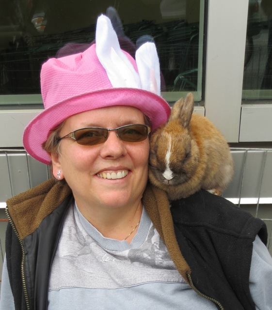 Yesterday was a tragic day in Rabbitats’ world. We had two bunnies at the vet, a challenged feral guy with an abscess under his chin, and our beloved Blaze in for a dental. We were expecting the bad news for the little grey feral, but when the phone rang, it was the vet saying that Blaze had a mouthful of tooth root infection and that he hadn’t responded well to the anesthetic. On the vet’s advice, we opted to not wake him up. Blaze was probably the most important bunny in Rabbitats history. He was ‘the hotdog bun’, the beat up little dwarf dumped at the Auto Mall years before we arrived there. He hung out by the hotdog stand and guarded his corner with gusto. At least from the guys. He was quite the ladies man. Once we started trapping the Auto Mall rabbits — all 300 of them — we realized that the majority of them were really small and had short ears and blazes. We ended up not being able to send them to the designated sanctuary in Washington State because of their small size, and they can thank Blaze for that. Most of all, we can thank Blaze for Deanna. Deanna, our shelter manager and an indispensable member of Rabbitats, wasn’t a rabbit person when she started helping out, she was a friend who stepped in to lend a hand. Blaze made her the stellar, dedicated bunny fan she is today. We can never thank him enough for that. He was her couch bunny and her shoulder bunny. They were pretty inseparable, at least until he met Buttercup, an owly diva lop girl. Deanna took her in as well because Blaze loved her. Blaze was at least nine. He was on the corner for four years and inside with us for another five. He will be mourned by all, especially Deanna. So sorry. RIP little guy.